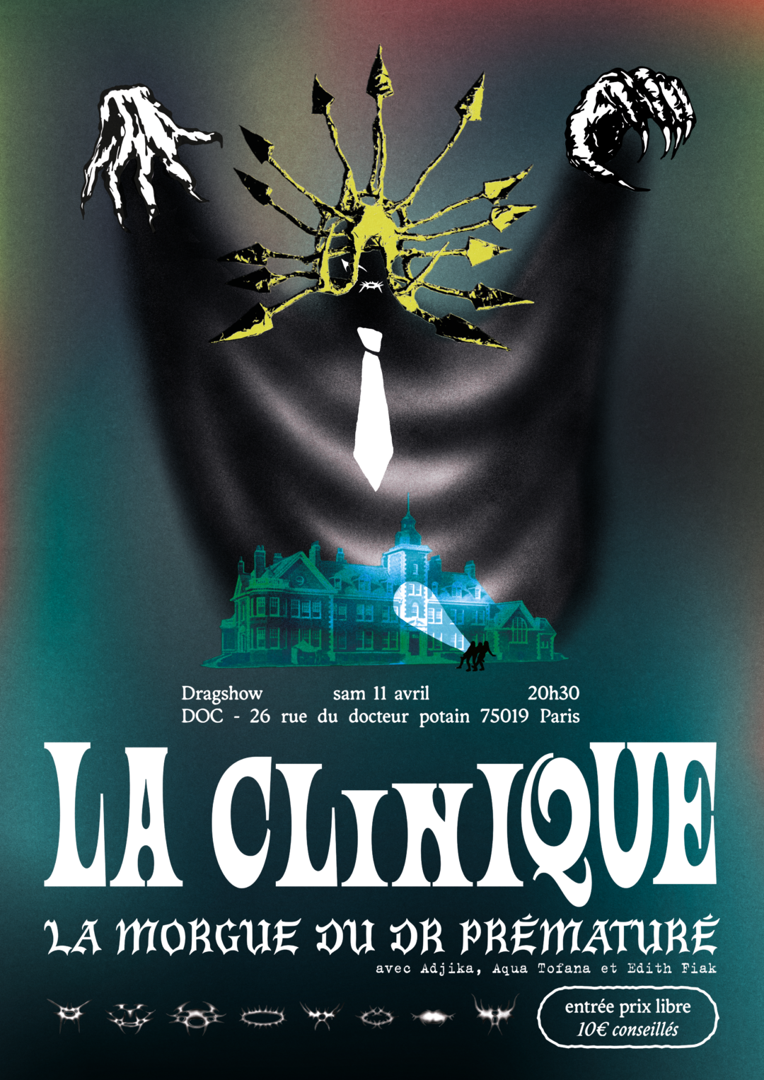 La Clinique rouvre ses portes pour une troisième édition : La Morgue du Dr Prématuré. Vous êtes convié·e à descendre plus bas que le cabinet… plus bas que les sous-sols oubliés, pour découvrir le service mortuaire de la Clinique. Pour l’occasion, Dr Prématuré vous présentera trois nouveaux cobayes : Adjika, Aqua Tofana et Edith Fiak. Un drag show queer à l’atmosphère étrange, entre humour noir, lumière froide et activité post-mortem légèrement préoccupante. N’ayez crainte : tout est parfaitement sous contrôle