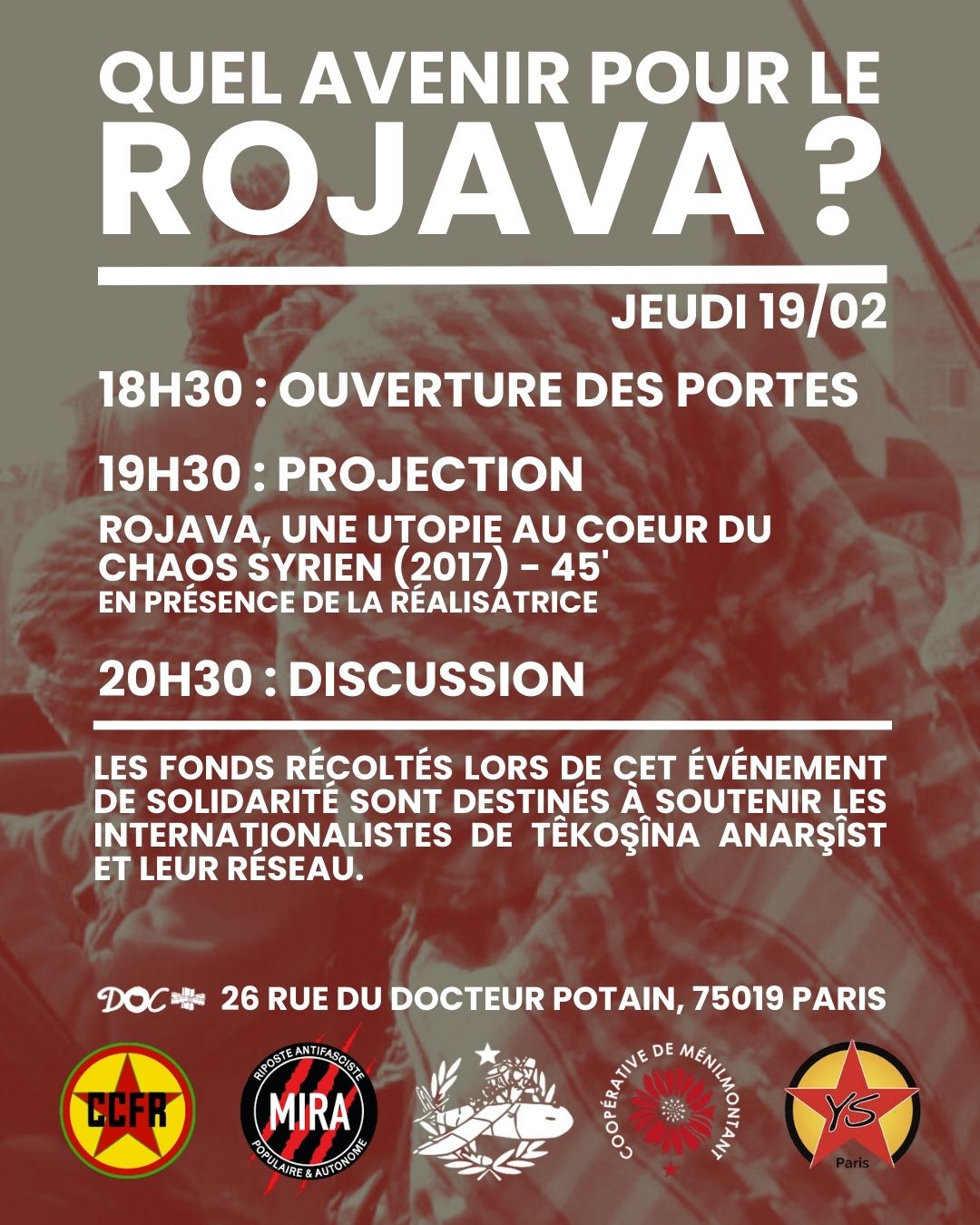 Rendez-vous jeudi 19 février au DOC! à partir de 18h30 pour une projection suivie d’une discussion sur l’avenir du Rojava, au nord-est de la Syrie.