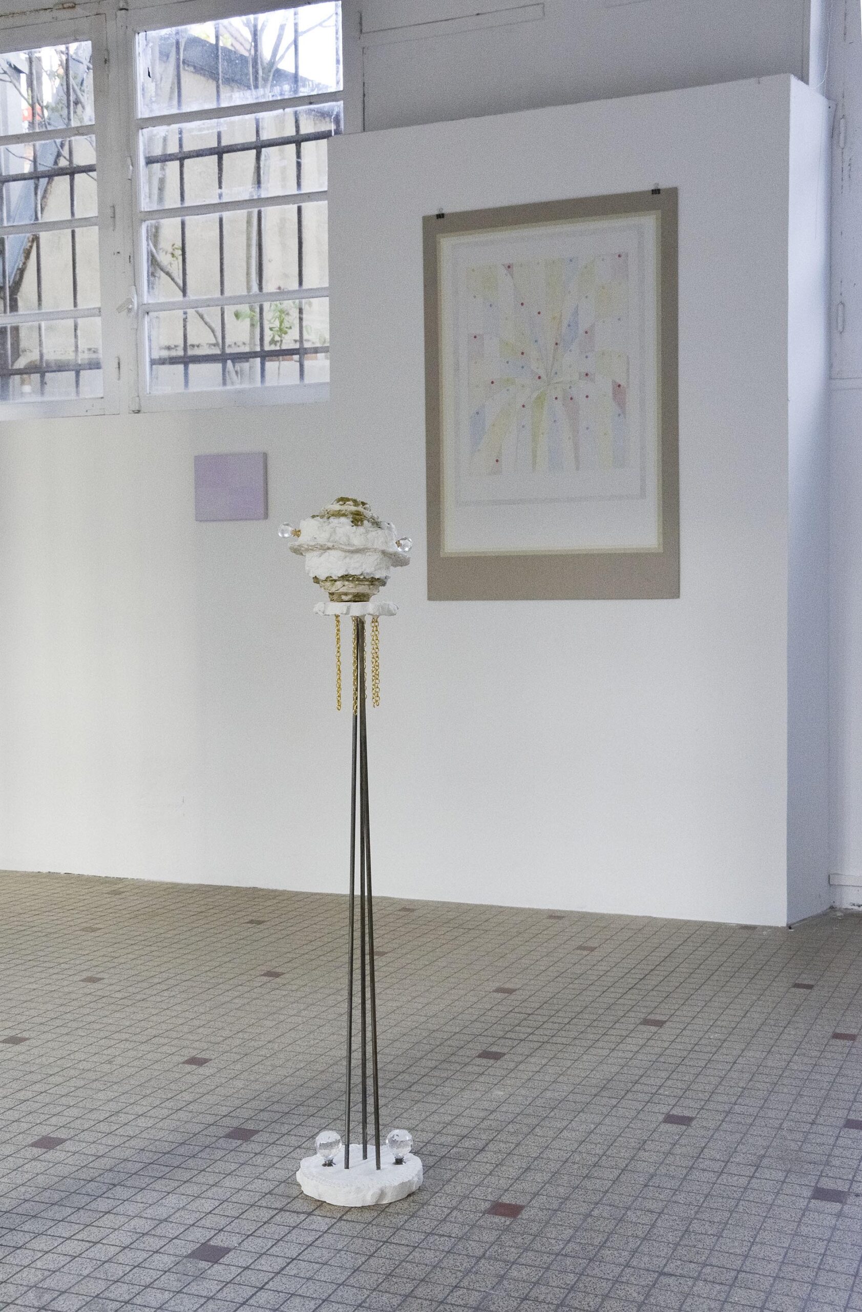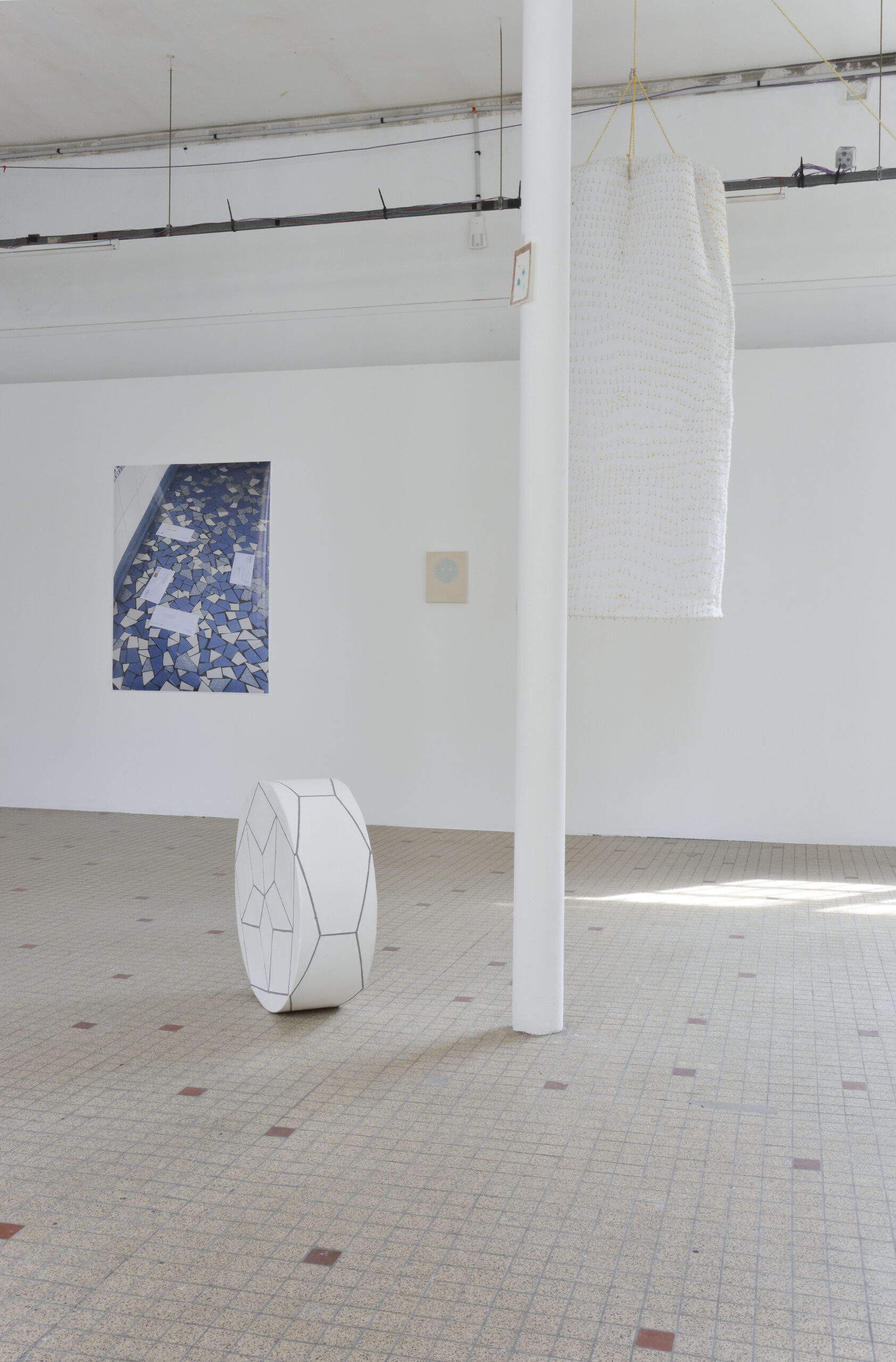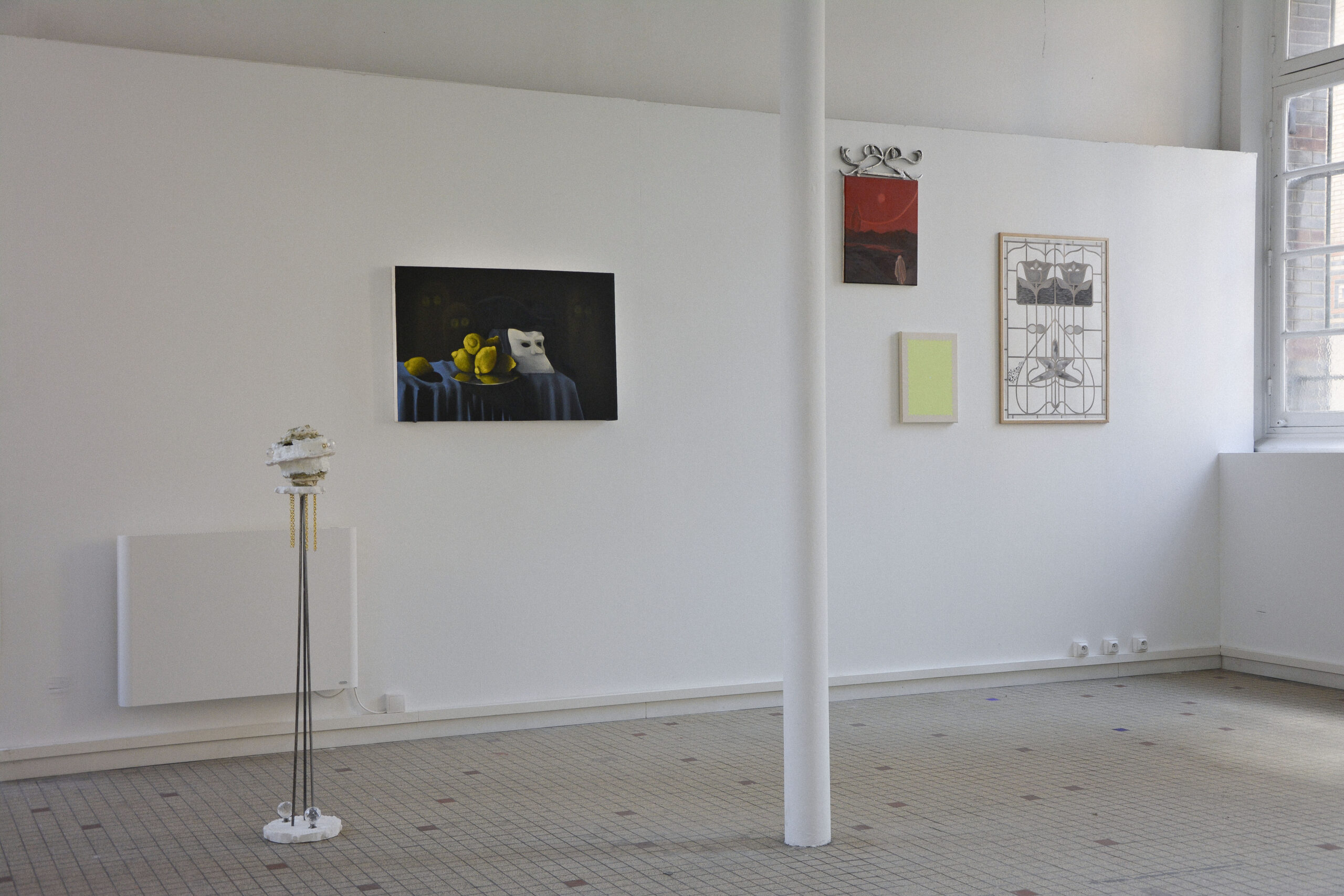 Dans cette exposition, les matières se mélangent et se présentent à vous comme un étrange scoubidou acidulé que le soleil aurait décoloré. Nous, jeunes plasticien.nes, vous invitons à accrocher cet objet quelque part avec vos clefs pour avoir toujours à portée de main cette douce chanson « Over the Rainbow »*.