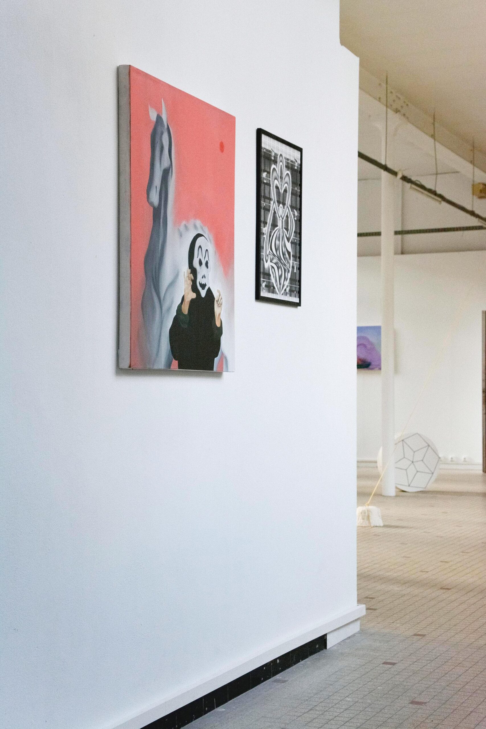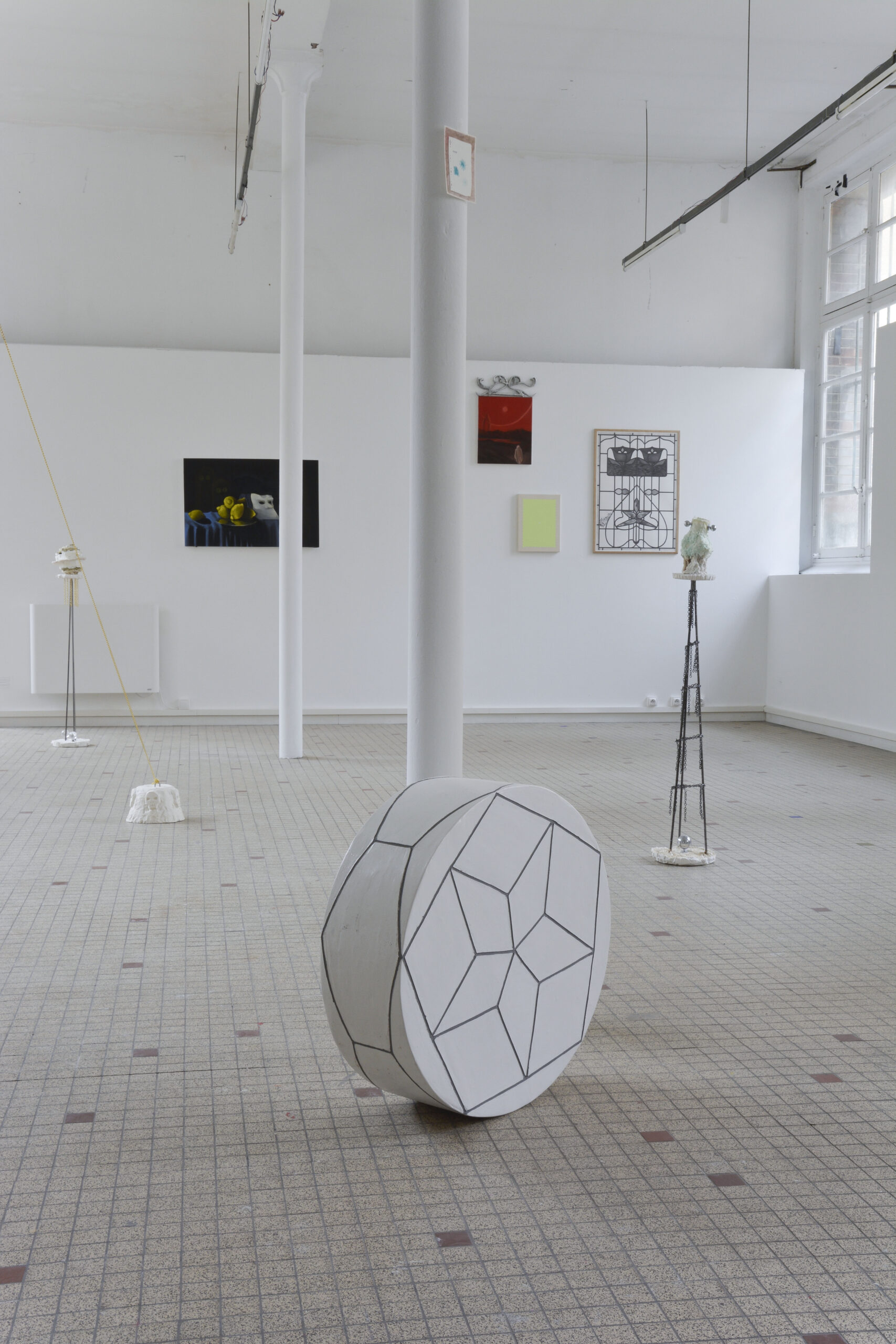 Il y a cette organicité en face du lisse et du contrôle des dessins d’Audrey Aumegeas. Les traits sont précis, voisins d’un remplissage plus voluptueux, presque flous parfois. Cohabitent avec ces espaces domestiques, les peintures de Marine Coullard habillées de leurs douces couleurs. Elles relèvent d’un travail presque maniaque de la ligne et la surface. Elles jouent avec des symboles et des aplats à travers des effets de transparence qui soulignent l’invisible dans le visible. L’invisible, Vincent Girard le figure, joueur, il évoque esprits et monstres pour venir troubler notre réalité. Il ouvre des fenêtres sur des paysages inconnus, fantasme ou délire et révèle la beauté d’une pêche que notre regard oublie souvent d’observer.