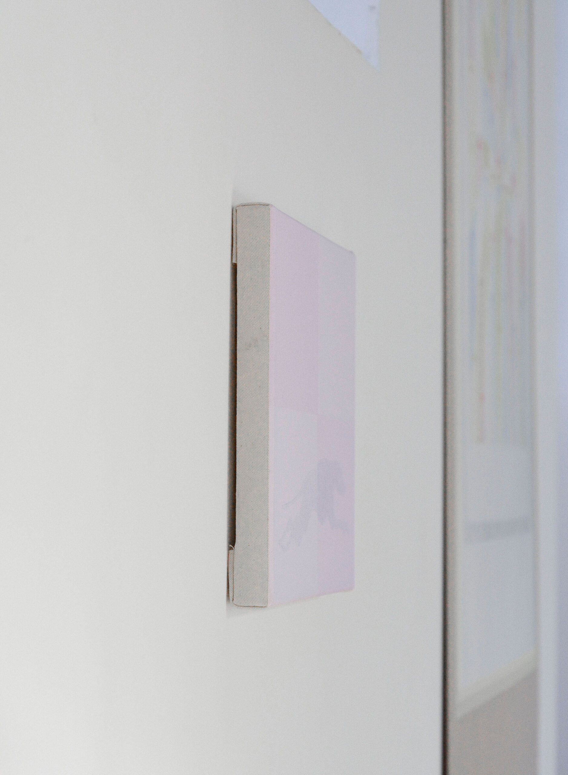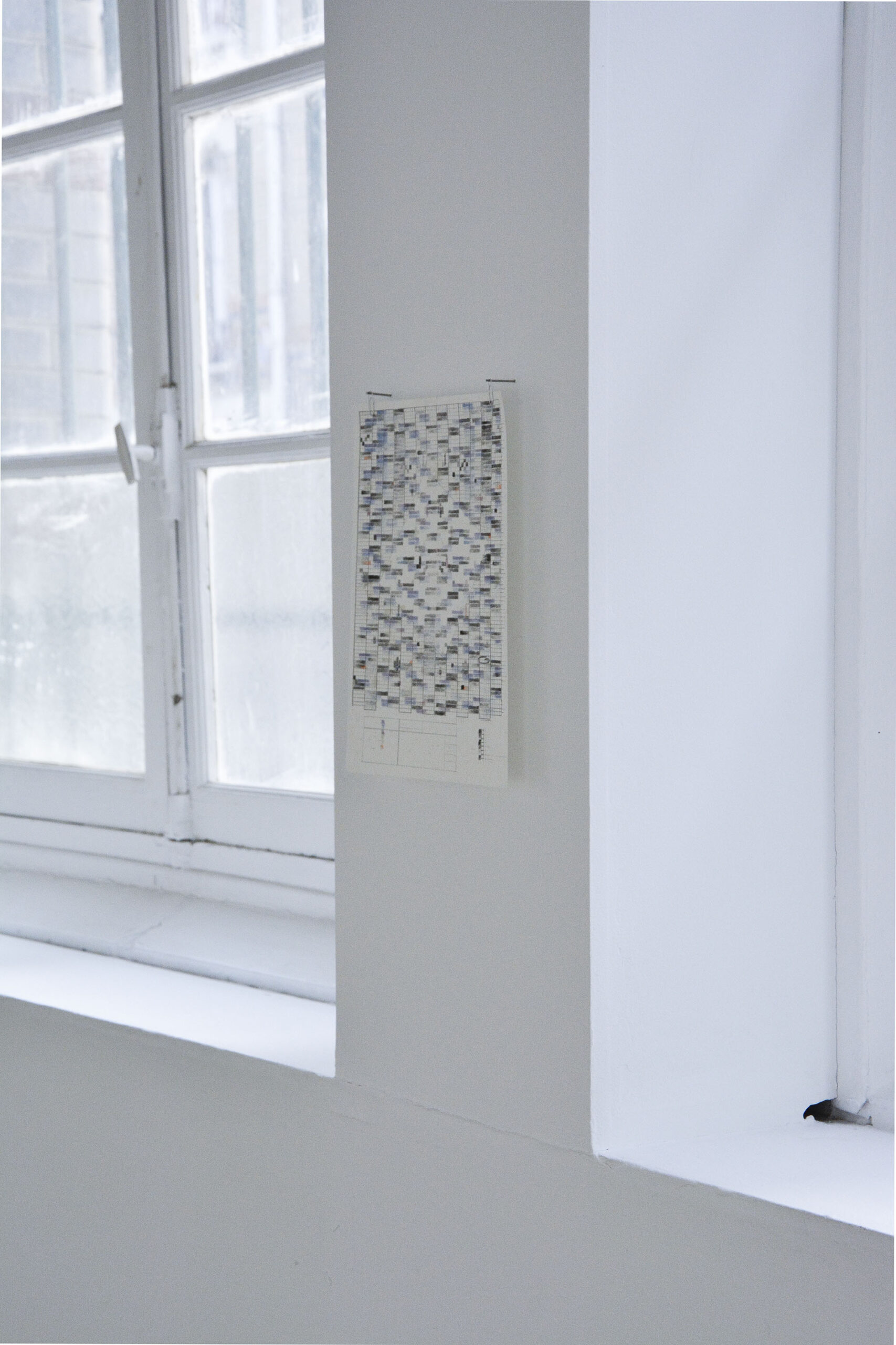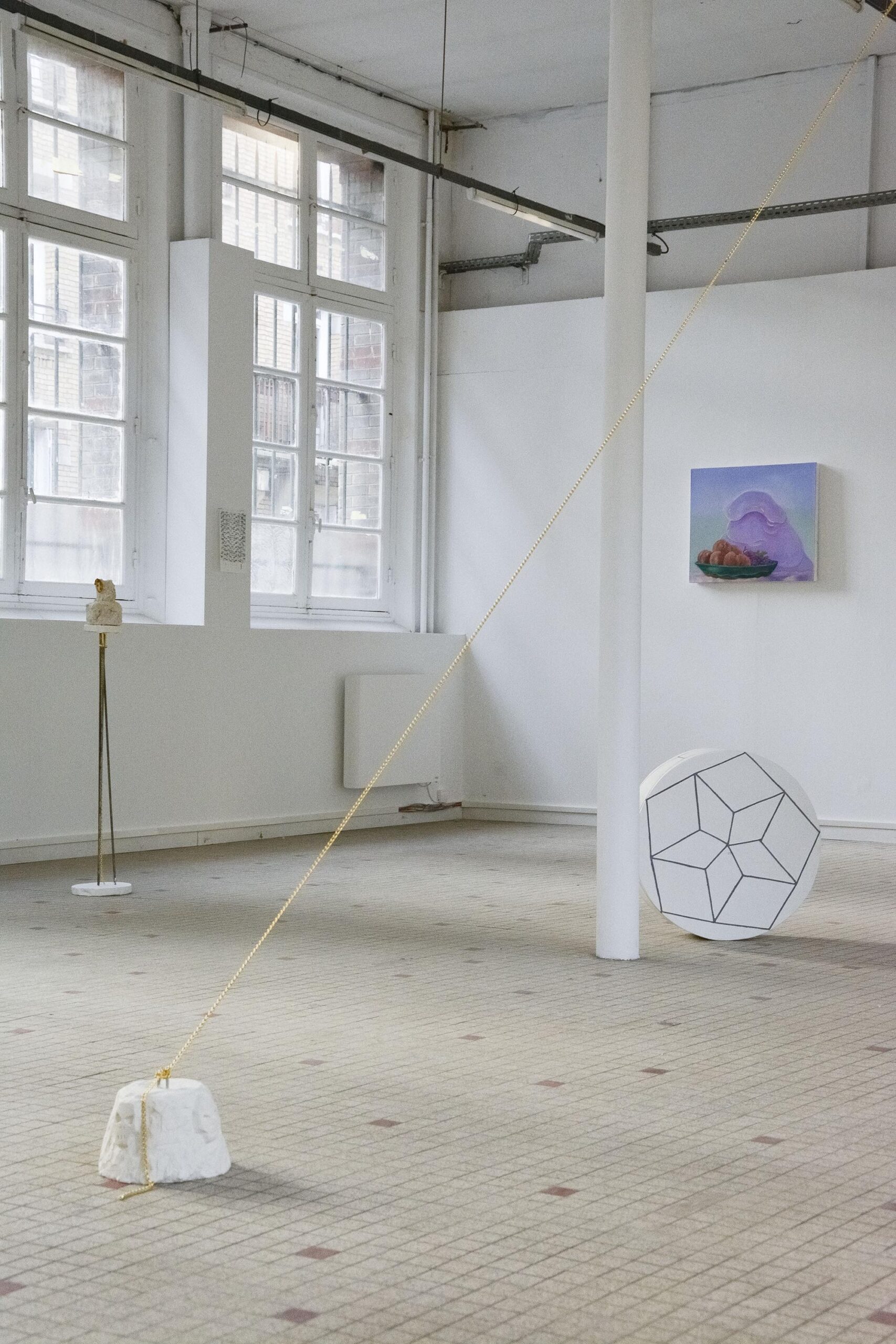 Ces détails sont dessinés chez Loïc Leclercq, absurde, vous observez un emploi du temps. Alors, ensemble, on se questionne sur la valeur de chacune de ces cases, on y cherche une histoire, on se projette dans la vie d’une personne fictive, peut-être celle de l’artiste. À défaut d’une réponse, on contemple le rythme et les nuances, une géométrie où le temps s’étire. Il s’écoule lentement, comme en vacances, les lettres ne sont pas ouvertes. Au bout de combien de temps le facteur se rend-il compte qu’il n’y a plus personne à cette adresse. Cette errance, Audrey Aumegeas nous la traduit en extrait de décor, d’époque oubliée, de design étrange. Elle crée des vitraux aussi cotonneux que de la ouate.